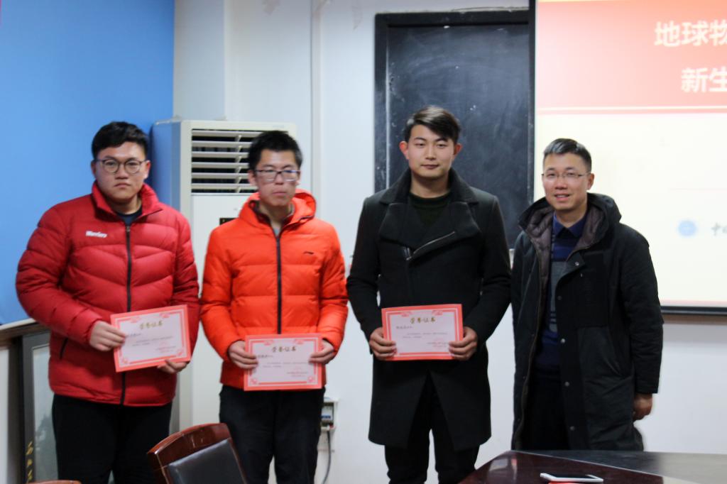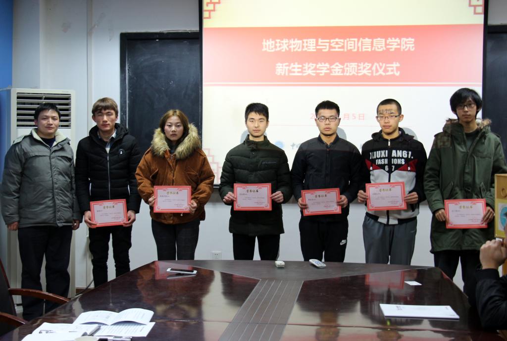在物探楼214召开2017级新生入学奖学金颁奖仪式。武汉中仪物联技术股份有限公司董事长郑洪标、学院党委副书记李周波,辅导员张川、祁阳阳,2017级各班班长、团支书以及10名获奖新生参会。