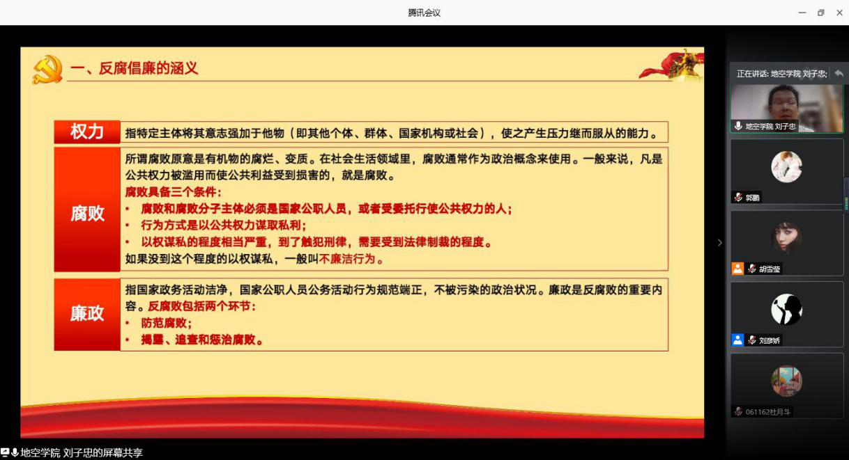 (通讯员刘彦娇 汪振)在2020届毕业生即将离校之际, 为深入学习贯彻习近平新时代中国特色社会主义思想和党的十九大精神,贯彻落实全国高校思想政治工作会议精神,紧紧围绕立德树人根本任务,积极培育和践行社会主义核心价值观,进一步引导毕业生廉洁修身,走好迈向社会的第一步,禁漫天堂下载 党委于6月24日晚19:30通过腾讯会议平台组织学院全体毕业生党员进行党员廉政教育。课程由学院党委书记刘子忠主讲,辅导员刘彦娇主持。