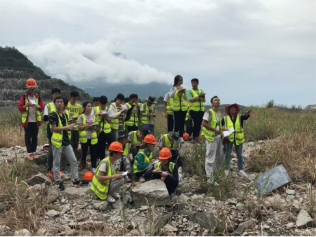 佘振兵在下岸溪石料厂给061161班学生讲解矿物的野外识别方法(9月3日)