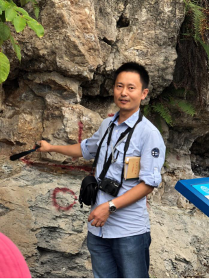 杨宝忠在九畹溪桥头给李四光学院0201165班学生讲解石龙洞组地层(9月3日)