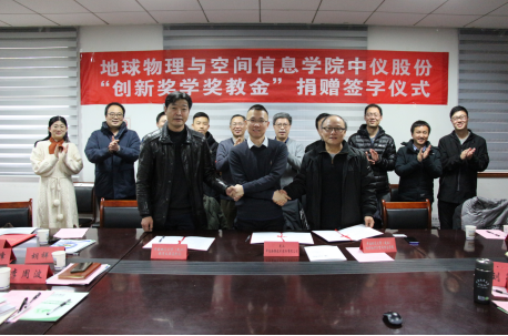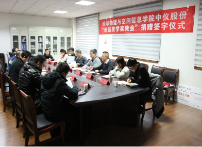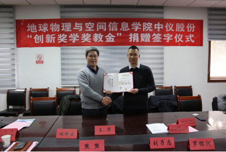 中仪股份“创新奖学奖教金”捐赠仪式在物探楼214会议室举行。武汉中仪物联技术股份有限公司董事长郑洪标、总经理助理张婉珈,副校长王华,学校教育发展基金会副秘书长吕占峰,禁漫天堂下载