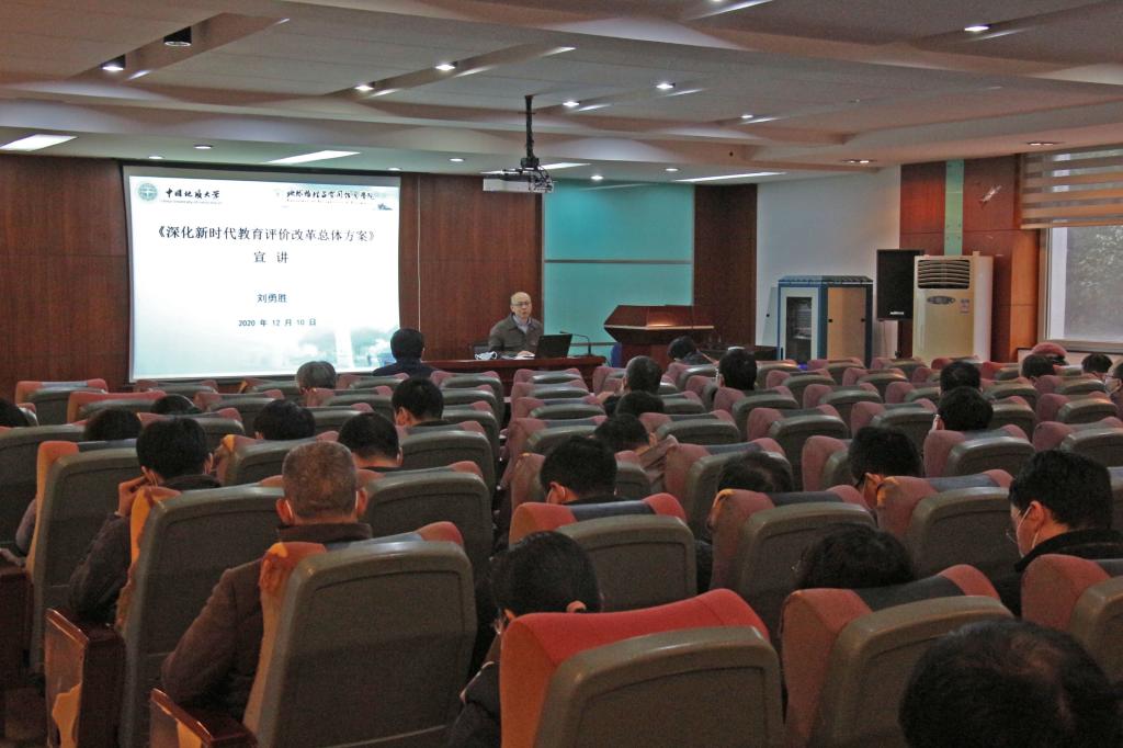 刘勇胜副校长分别从导语、总体要求、重点任务及组织实施等方面对《总体方案》的主要内容和精神进行了宣讲。他强调,学院教师要加强学习,深刻领会《总体方案》重大意义,深刻理解“为什么改”“改什么”“怎么改”三个关键问题。同时,他结合目前学校实际,对《总体方案》涉及的五个方面22项任务进行了重点解读。他指出,要坚持以立德树人为主线,以破“五唯”为导向,以五类主体为抓手,做到政策系统集成、举措破立结合、任务协同推进,切实让各项任务举措落地见效。