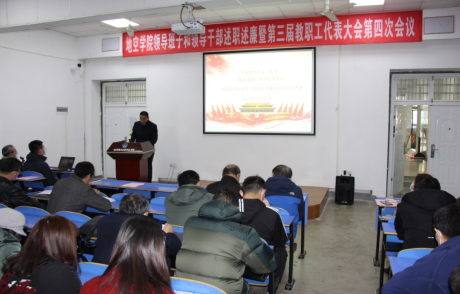 在基委楼101会议室召开2021年领导班子和领导干部述职述廉暨第三届教职工、工会会员代表大会第四次会议。党委常委、副校长刘勇胜、全院教职工及学生代表参加会议。